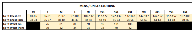 | Chest (to fit) | 33/34 | 35/37 | 38/40 | 41/43 | 44/47 | 48/50 | 51/53 | 54/56 | 58/60 | 61/63 | 64/68 | 70/76 |