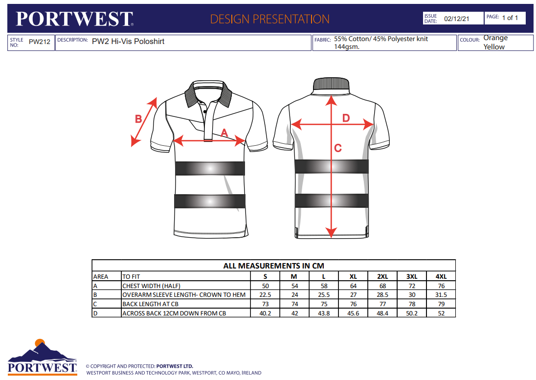 Portwest PW212 - PW2 Hi-Vis Cotton Comfort Polo Shirt S/S PW212